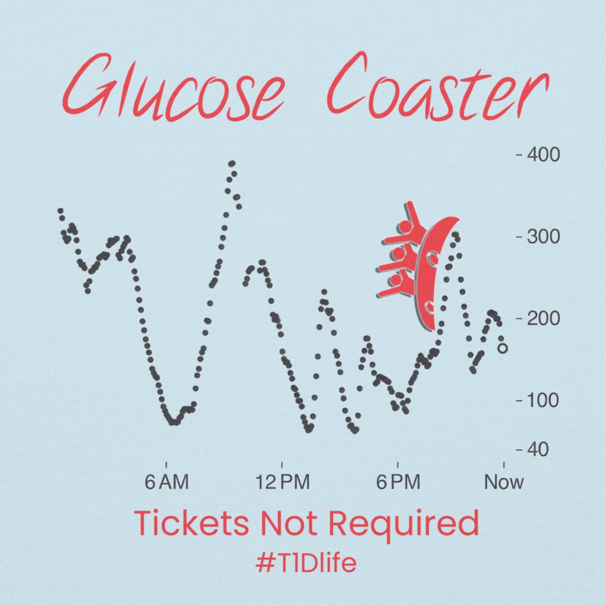 This eye-catching design captures the wild ride of blood sugars through a Dexcom-style 24-hour chart, complete with a rollercoaster car climbing those dramatic highs and drops.