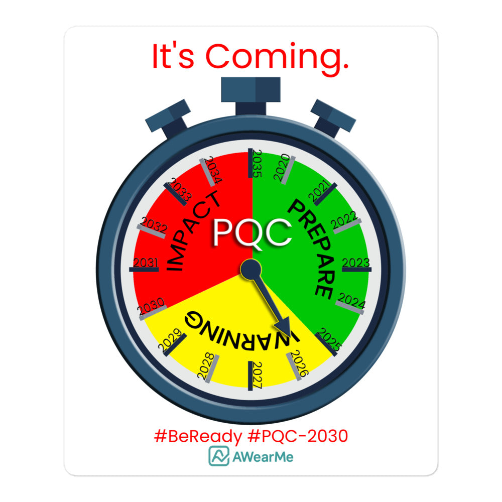 Featuring a stopwatch design, the sticker visually marks the shift from Prepare (2020–2025) to Warning (2025–2030) and finally Impact (2030–2035)—a timeline every security professional should take seriously. The hand points to 2025–2026, right where we are today, emphasizing the urgency to act before quantum computers break legacy encryption.